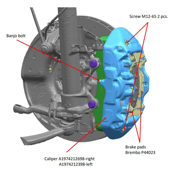 A1974212698 Mercedes-Benz AMG front caliper Right side A1974212398 Mercedes-Benz AMG front caliper Left side P44023 Brembo brake pads (compatible with the calipers above)