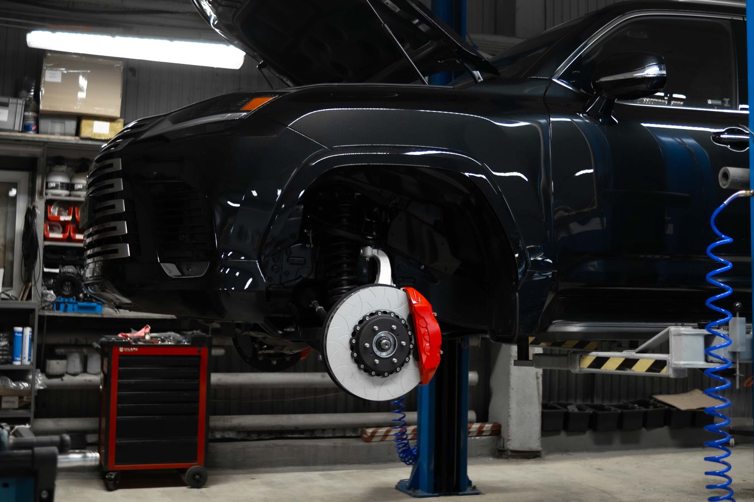 Full Brake system upgrade for Lexus LX600 with 6-piston front brake calipers and brake discs 420-44mm. Rear 4-piston brake calipers with 410-33mm brake discs.